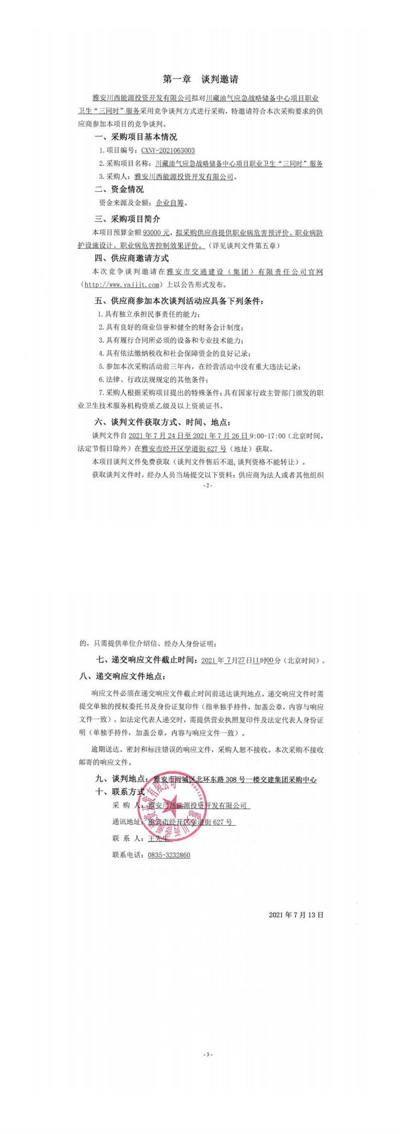 雅安川西能源投资开发有限公司川藏油气应急战略储备中心项目职业卫生“三同时”服务竞争谈判公告