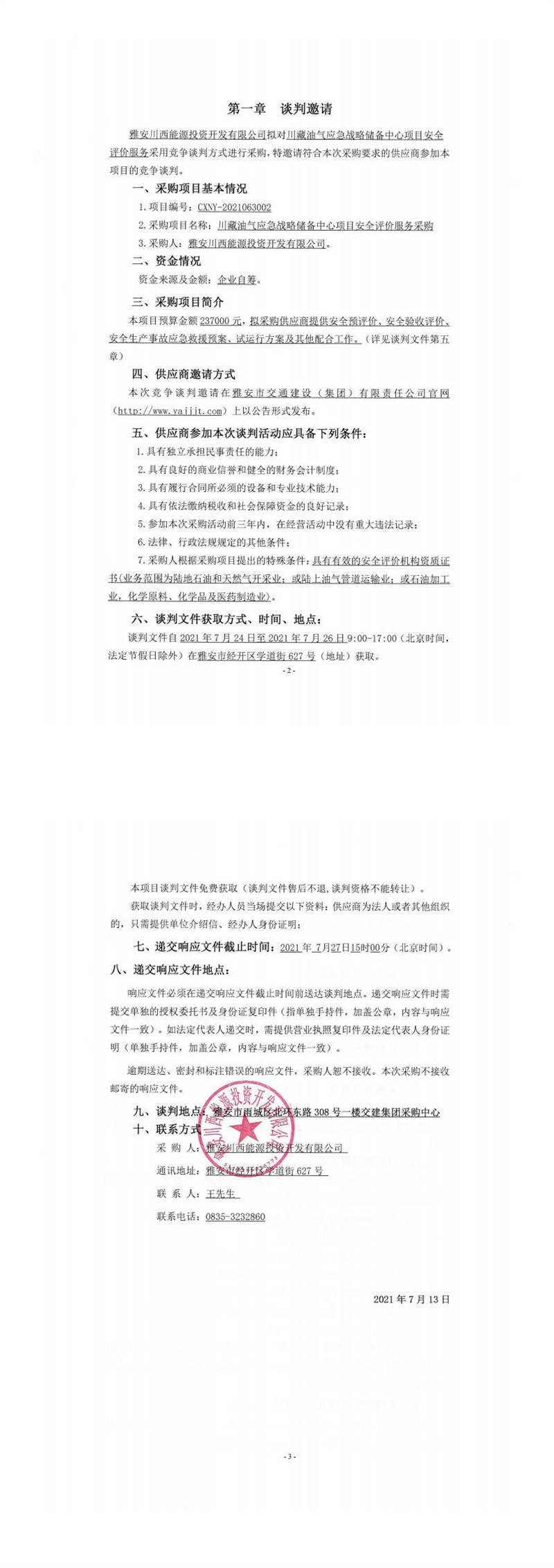 雅安川西能源投资开发有限公司川藏油气应急战略储备中心项目安全评价服务采购竞争谈判公告