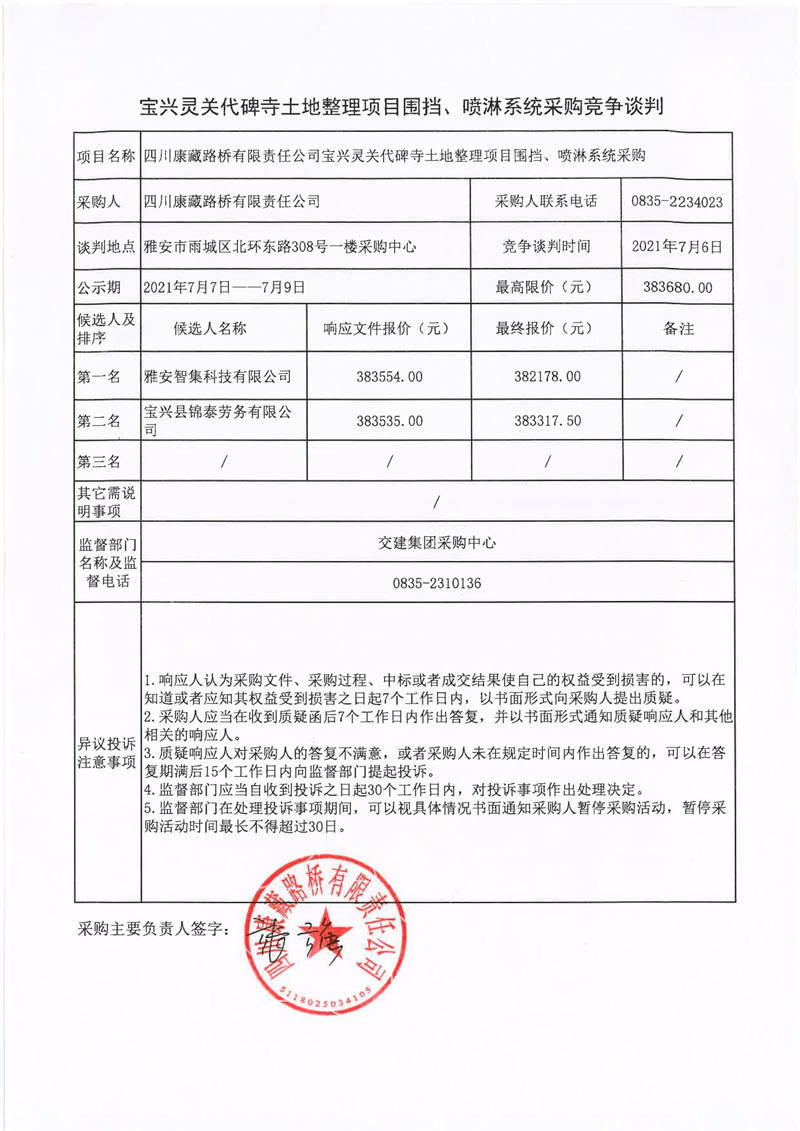 四川康藏路桥有限责任公司宝兴灵关代碑寺土地整理工程项目围挡、喷淋系统采购竞争谈判结果公示