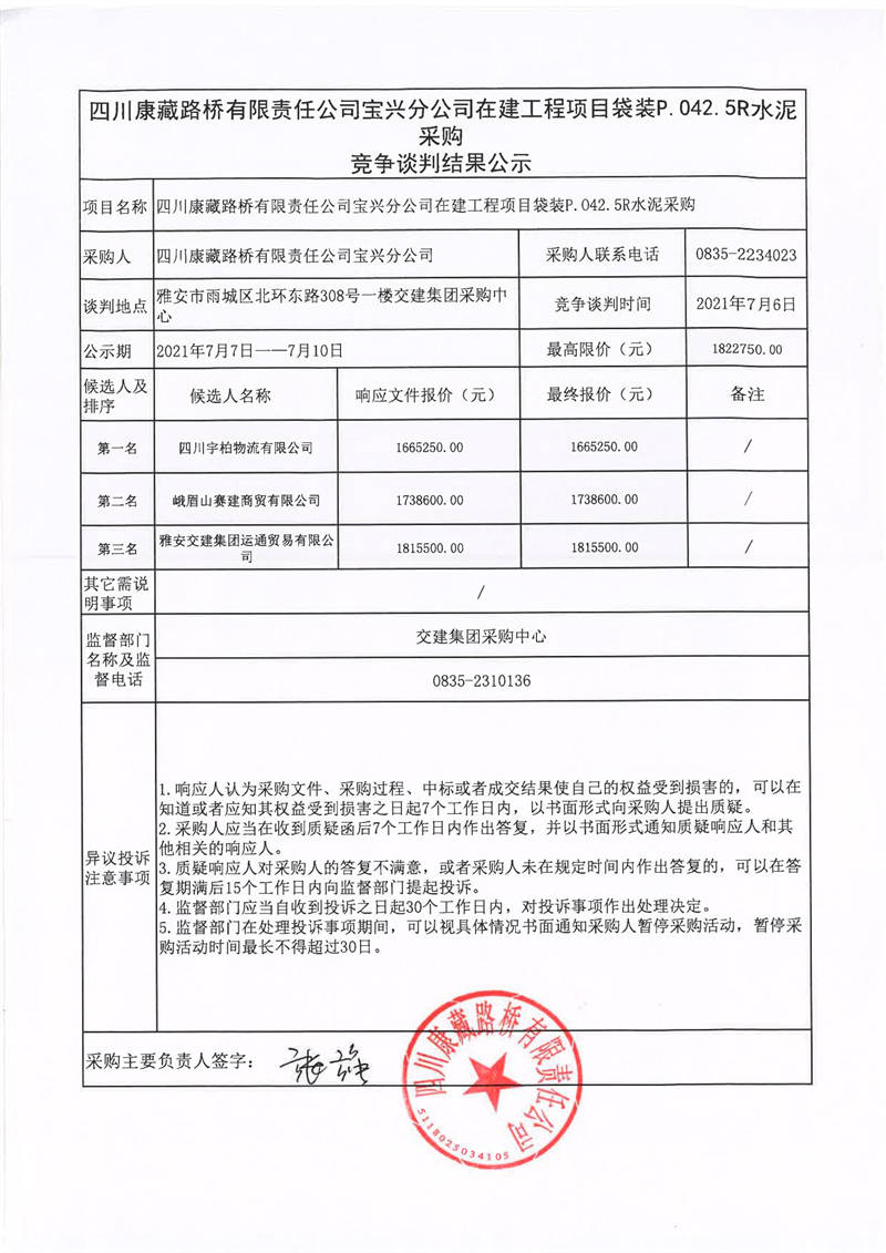 四川康藏路桥有限责任公司宝兴分公司在建工程项目袋装P.042.5R水泥采购竞争谈判结果公示