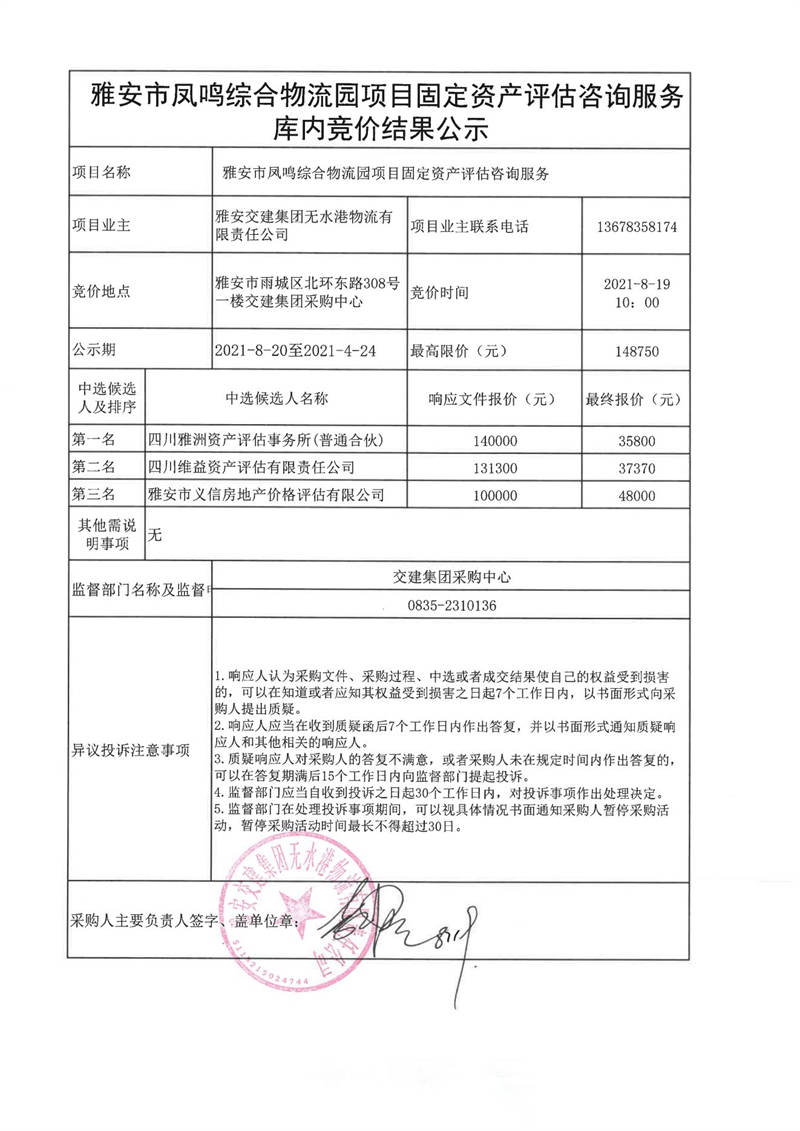 米兰体育-米兰(中国)官网 无水港物流有限责任公司雅安市凤鸣综合物流园项目固定资产评估咨询服务库内竞价结果公示