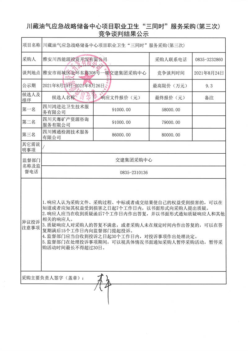 雅安川西能源投资开发有限公司川藏油气应急战略储备中心项目职业卫生“三同时”服务采购(第三次)竞争谈判结果公示