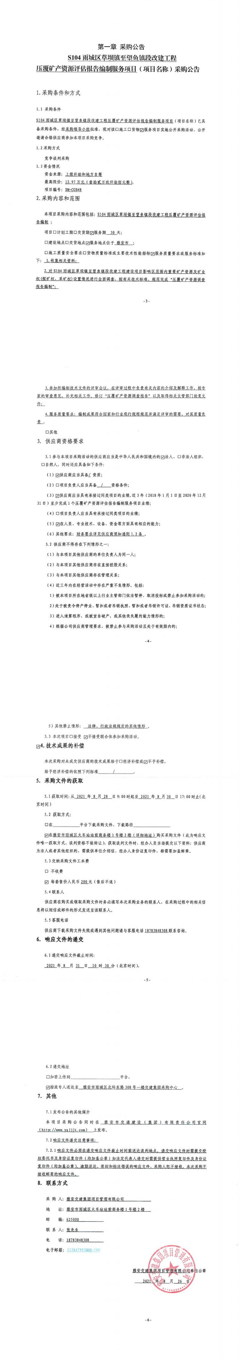 米兰体育-米兰(中国)官网 项目管理有限公司S104雨城区草坝镇至望鱼镇段改建工程压覆矿产资源评估报告编制服务项目采购公告