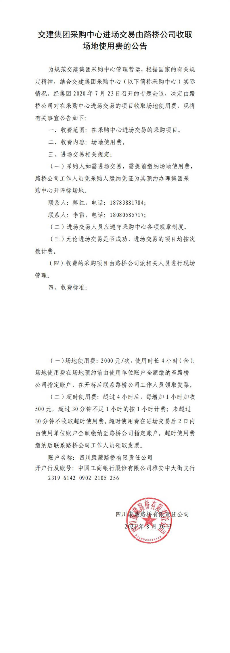 交建集团采购中心进场交易由路桥公司收取场地使用费的公告