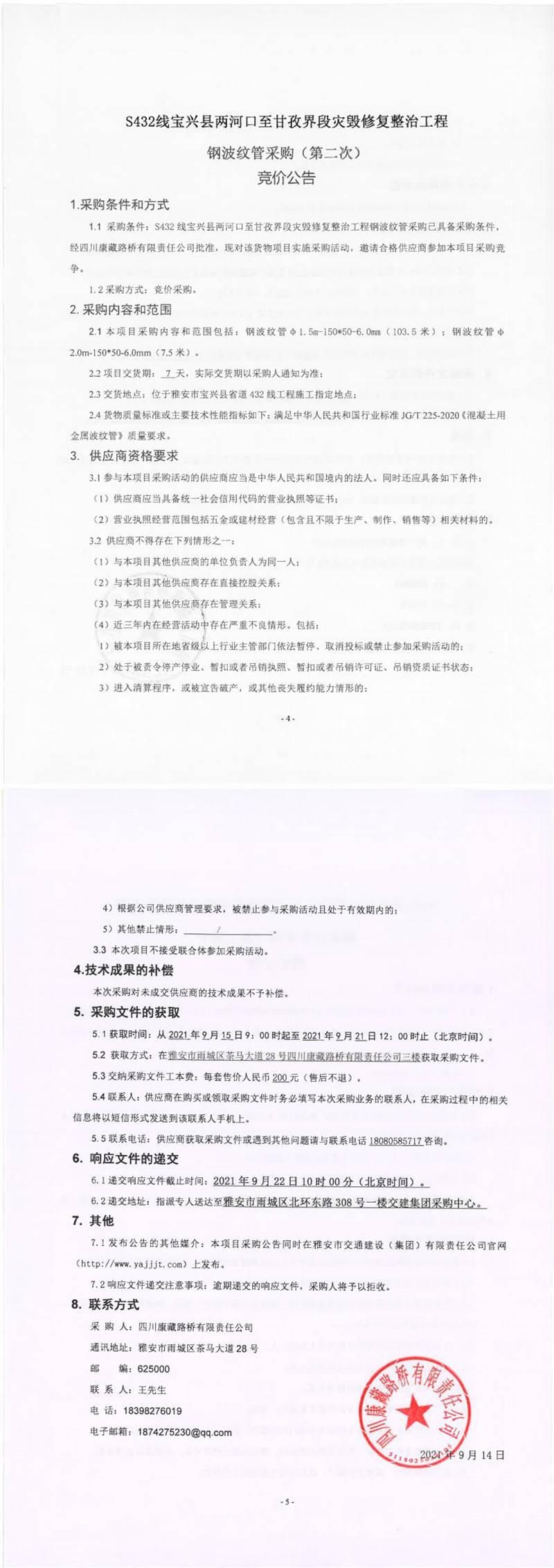 四川康藏路桥有限责任公司S432线宝兴县两河口至甘孜界段灾毁修复整治工程钢波纹管采购(第二次)竞价公告