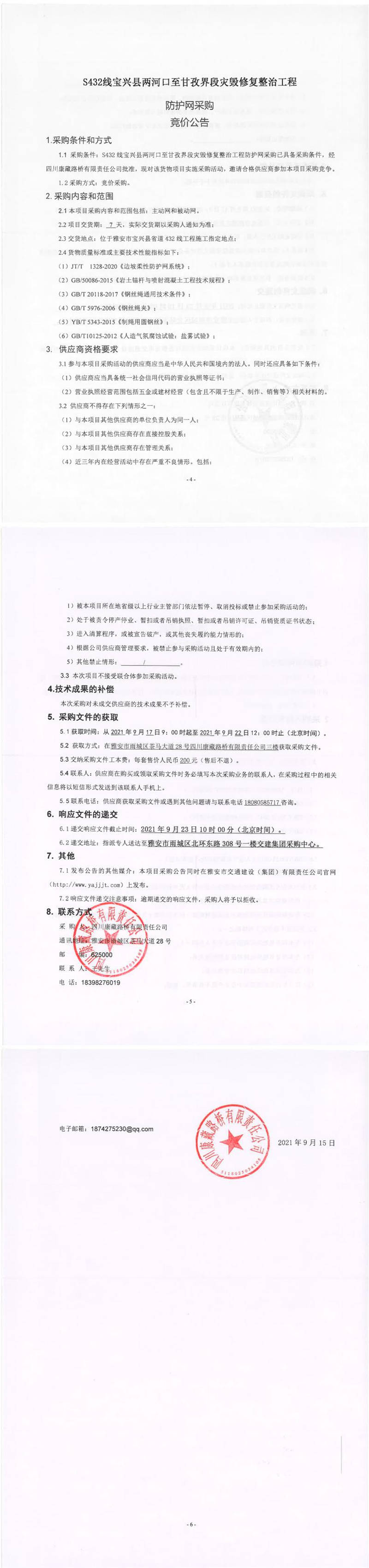 四川康藏路桥有限责任公司S432线宝兴县两河口至甘孜界段灾毁修复整治工程防护网采购竞价公告