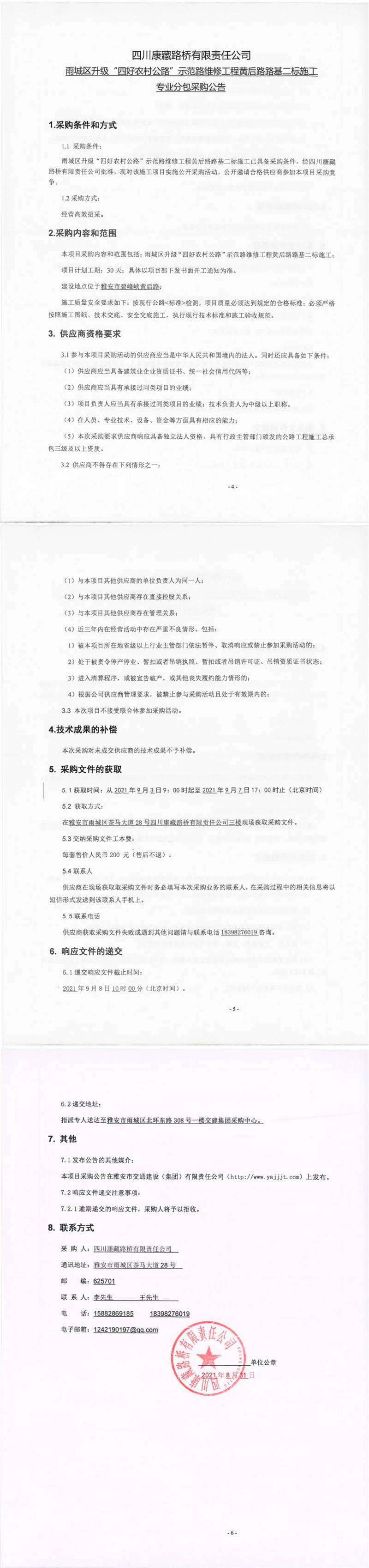 四川康藏路桥有限责任公司雨城区升级“四好农村公路”示范路维修工程黄后路路基二标施工专业分包采购公告