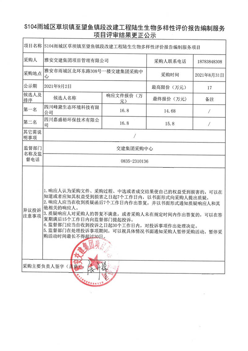 米兰体育-米兰(中国)官网 项目管理有限公司S104雨城区草坝镇至望鱼镇段改建工程陆生生物多样性评价报告编制服务项目评审结果更正公示