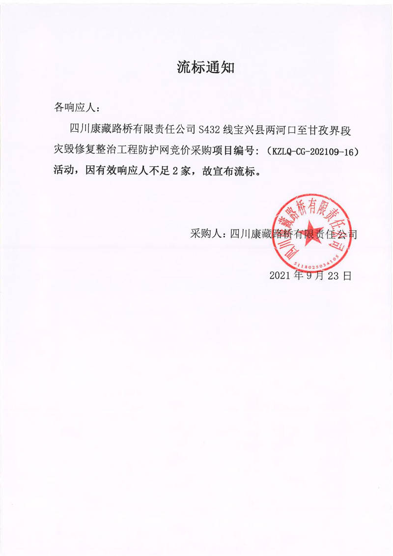 四川康藏路桥有限责任公司S432线宝兴县两河口至甘孜界段灾毁修复整治工程防护网采购流标通知
