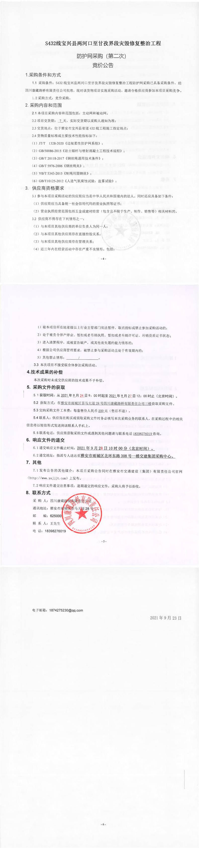 四川康藏路桥有限责任公司S432线宝兴县两河口至甘孜界段灾毁修复整治工程防护网采购(第二次)竞价公告