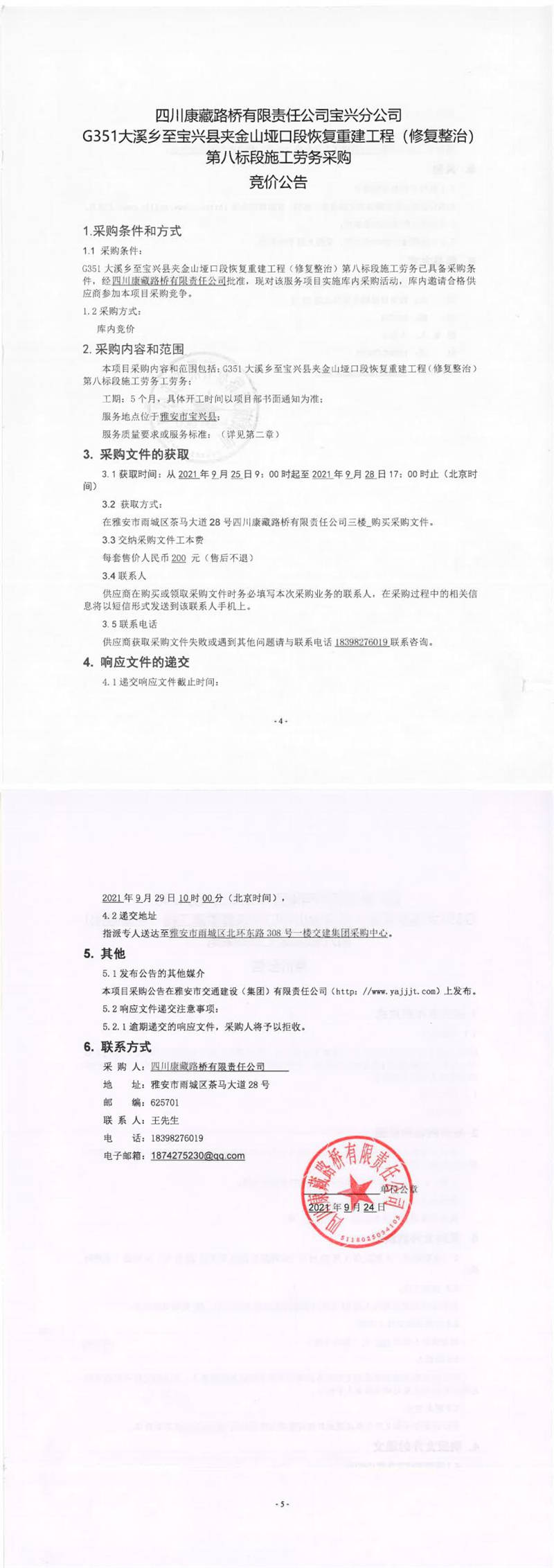 四川康藏路桥有限责任公司宝兴分公司G351大溪乡至宝兴县夹金山垭口段恢复重建工程(修复整治)第八标段施工劳务采购竞价公告