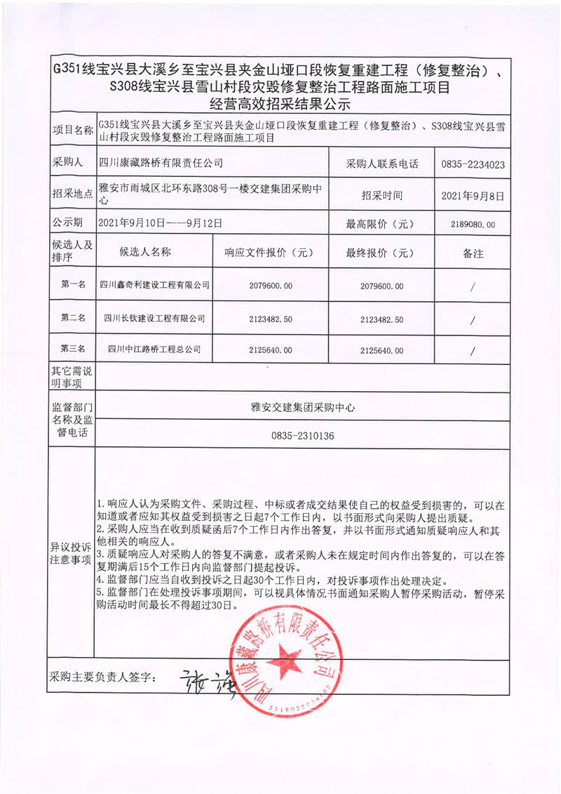 四川康藏路桥有限责任公司G351线宝兴县大溪乡至宝兴县夹金山哑口段恢复重建工程(修复整治)、S308线宝兴县雪山村段灾毁修复整治工程路面施工项目经营高效招采结果公示