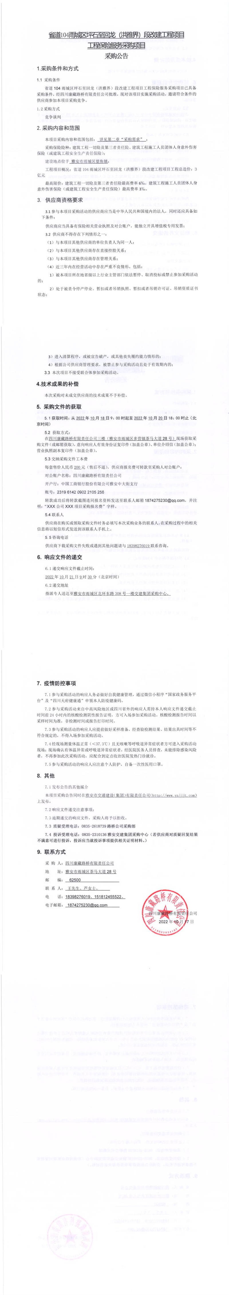 四川康藏路桥有限责任公司省道104雨城区坪石至回龙(洪雅界)段改建工程项目工程保险服务采购项目采购公告