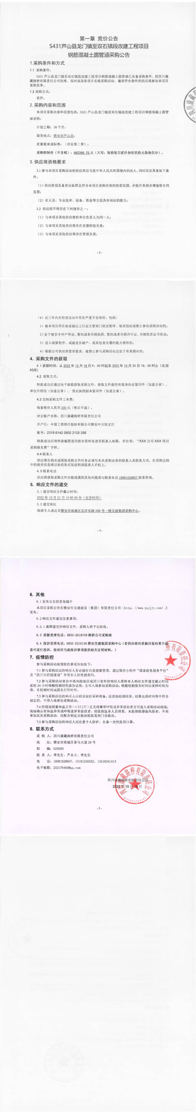 四川康藏路桥有限责任公司S431芦山县龙门镇至双石镇段改建工程项目钢筋混凝土圆管涵采购公告