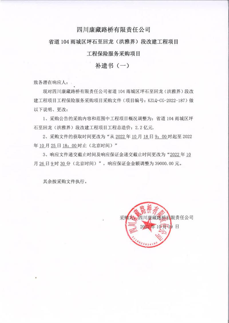 四川康藏路桥有限责任公司省道104雨城区坪石至回龙(洪雅界)段改建工程项目工程保险服务采购项目补遗书(一)