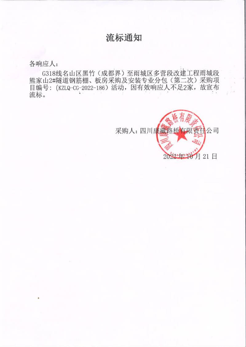 四川康藏路桥有限责任公司G318线名山区黑竹(成都界)至雨城区多营段改建工程雨城段熊家山2#隧道钢筋棚、板房采购及安装专业分包采购(第二次)流标通知