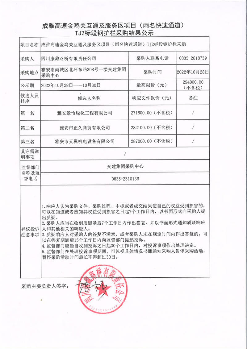 四川康藏路桥有限责任公司成都高速金鸡关互通及服务区项目(雨名快速通道)TJ2标段钢护栏采购结果公示