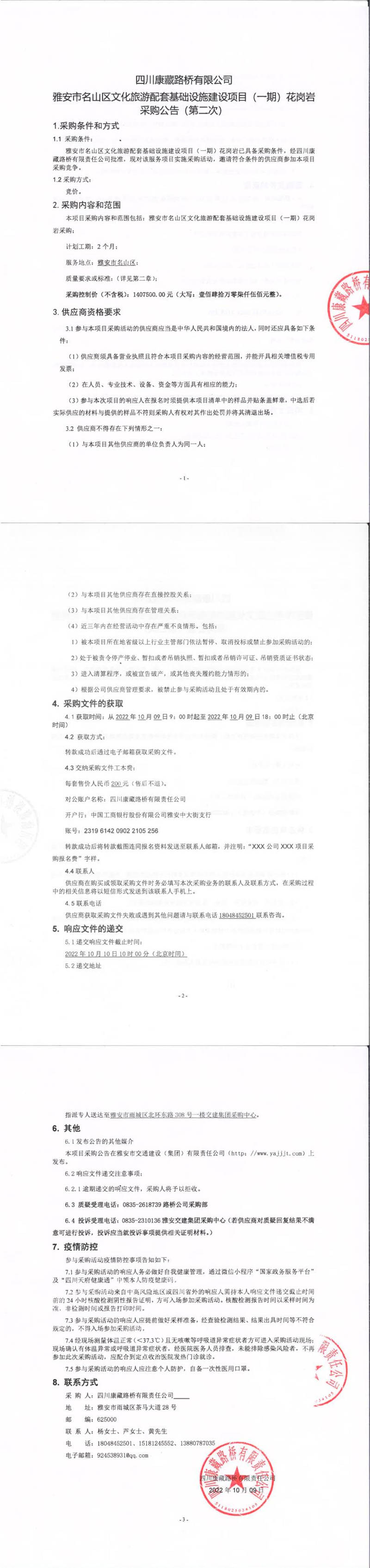 四川康藏路桥有限责任公司雅安市名山区文化旅游配套基础设施建设项目(一期)花岗岩采购公告(第二次)