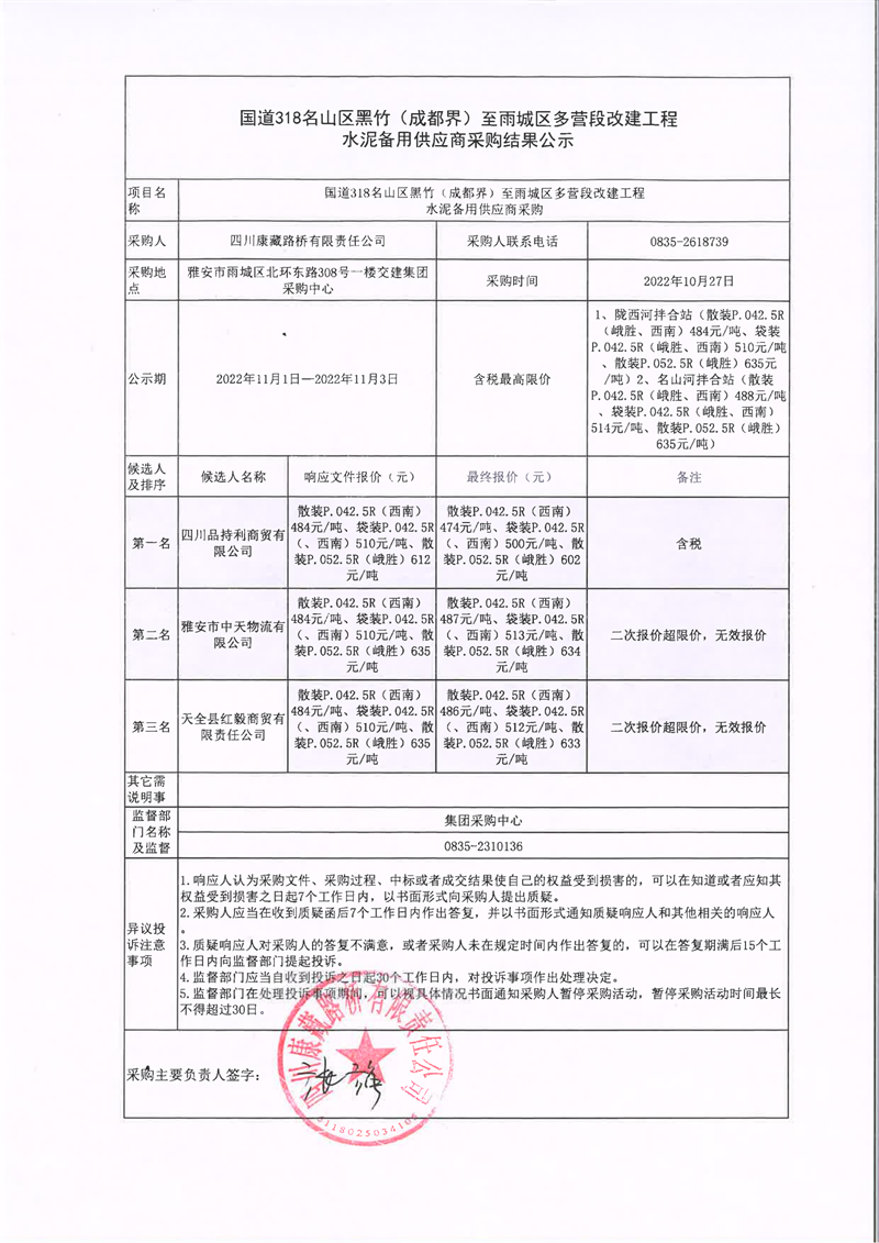 四川康藏路桥有限责任公司国道318名山区黑竹(成都界)至雨城区多营段改建工程水泥备用供应商采购结果公示