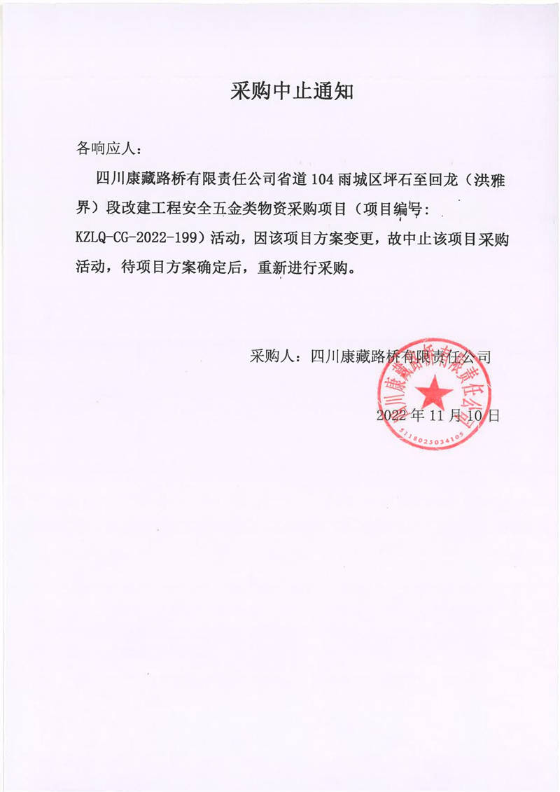 四川康藏路桥有限责任公司省道104雨城区坪石至回龙(洪雅界)段改建工程安全五金类物资采购项目采购中止通知