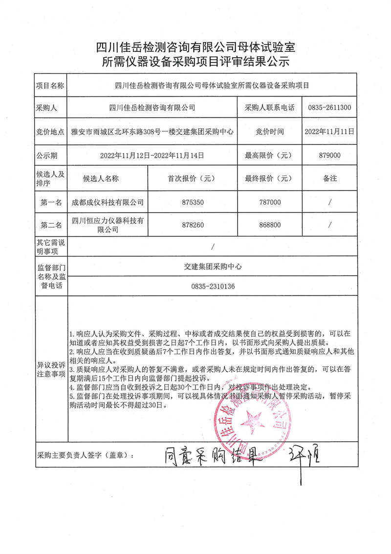 四川佳岳检测咨询有限公司母体试验室所需仪器设备采购项目评审结果公示