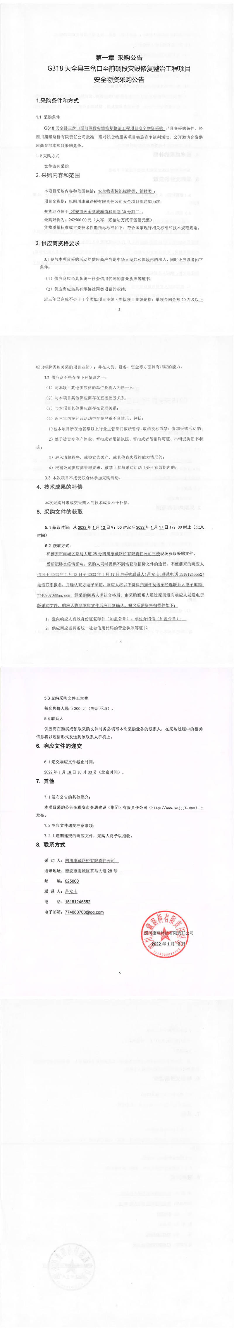 四川康藏路桥有限责任公司G318天全县三岔口至前碉段灾毁修复整治工程项目安全物资采购公告