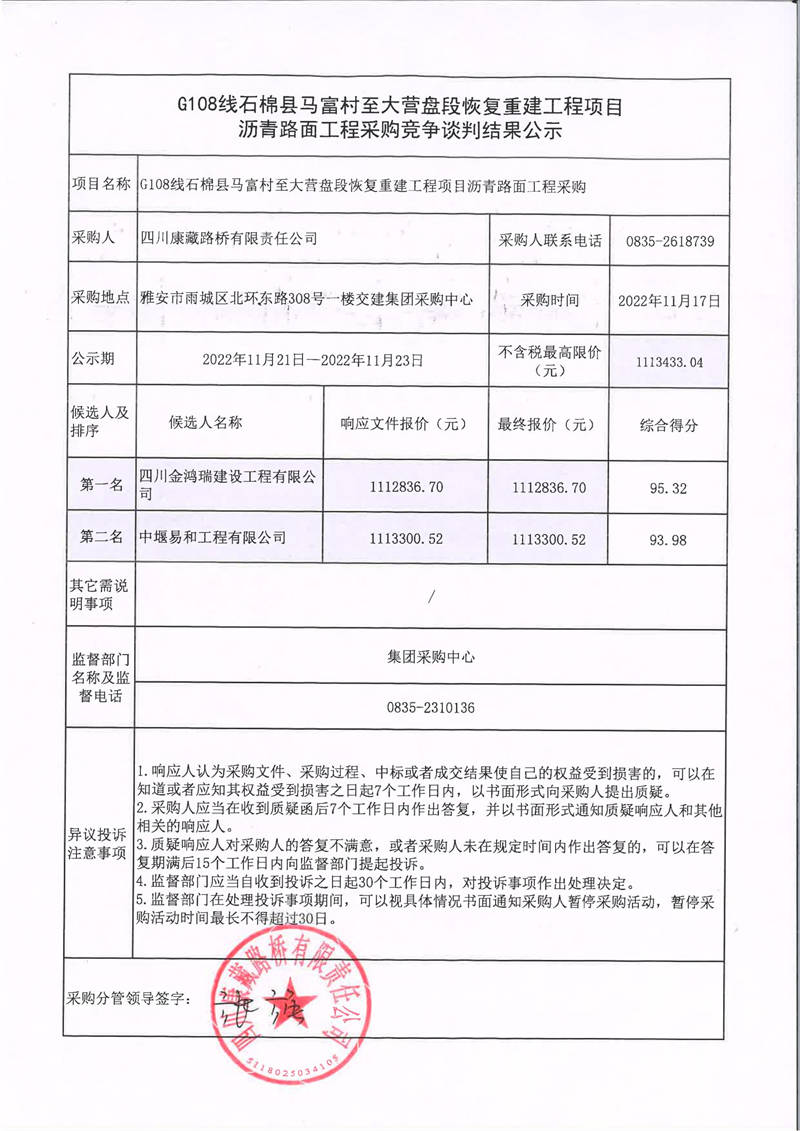 四川康藏路桥有限责任公司G108线石棉县马富村至大营盘段恢复重建工程项目沥青路面工程采购竞争谈判结果公示