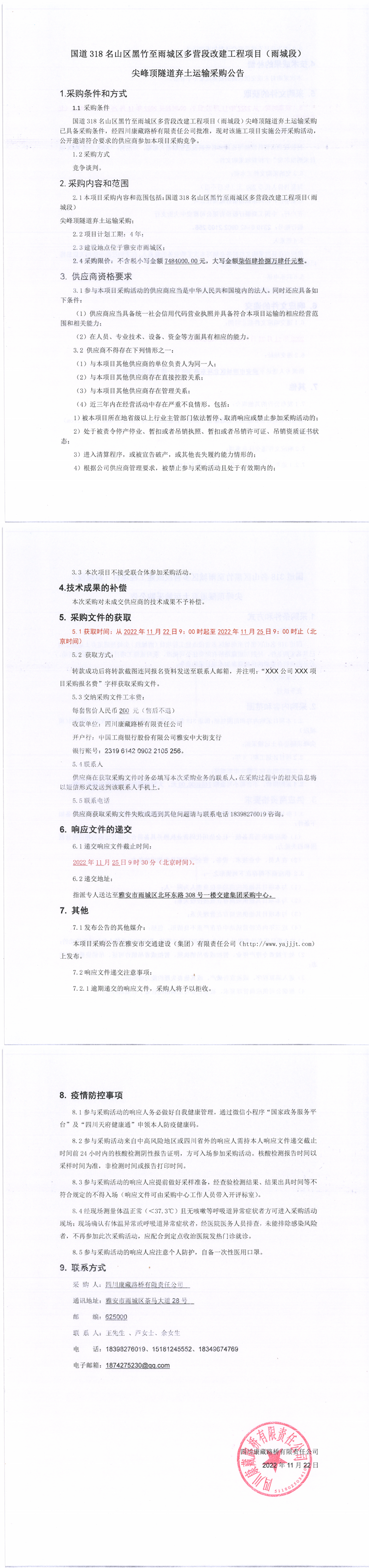 四川康藏路桥有限责任公司国道318名山区黑竹至雨城区多营段改建工程项目(雨城段)尖峰顶隧道弃土运输采购公告
