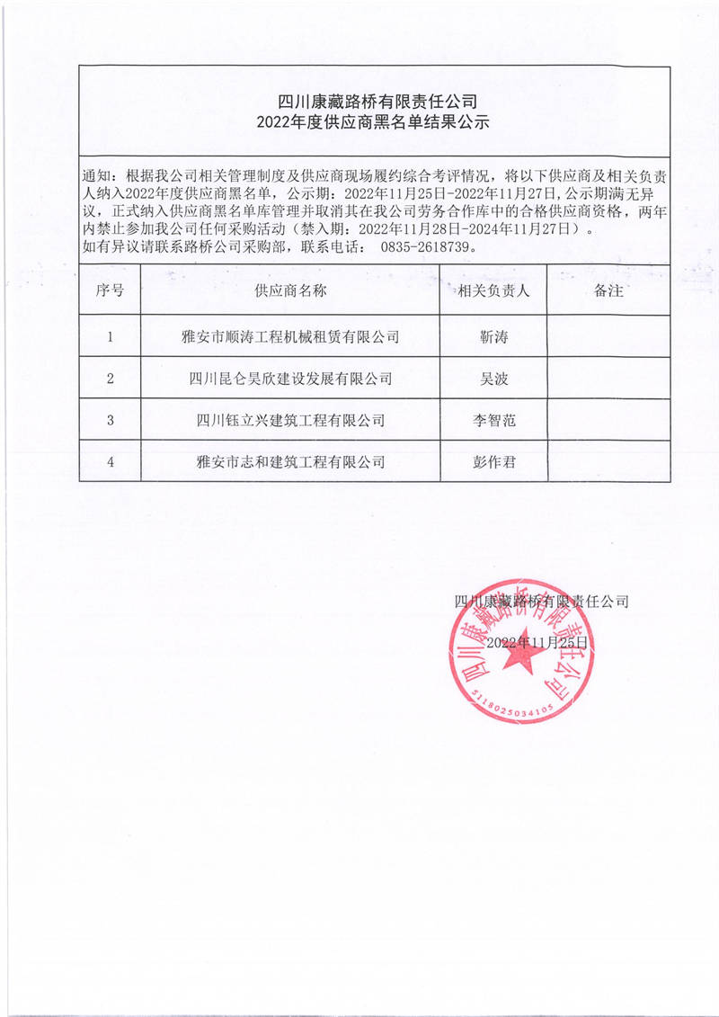 四川康藏路桥有限责任公司2022年度供应商黑名单结果公示