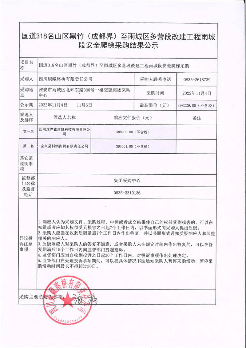 四川康藏路桥有限责任公司国道318名山区黑竹(成都界)至雨城区多营段改建工程雨城段安全爬梯采购结果公示