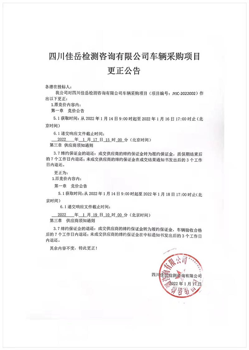 四川佳岳检测咨询有限公司车辆采购项目更正公告