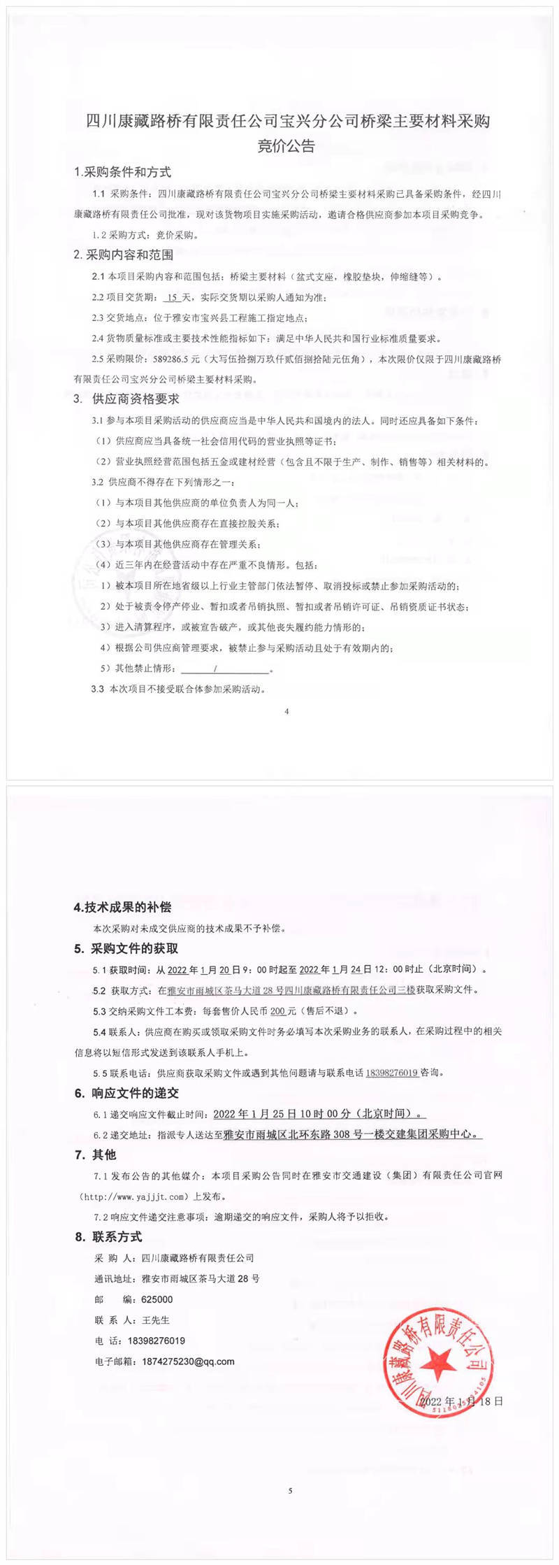 四川康藏路桥有限责任公司宝兴分公司桥梁主要材料采购竞价公告
