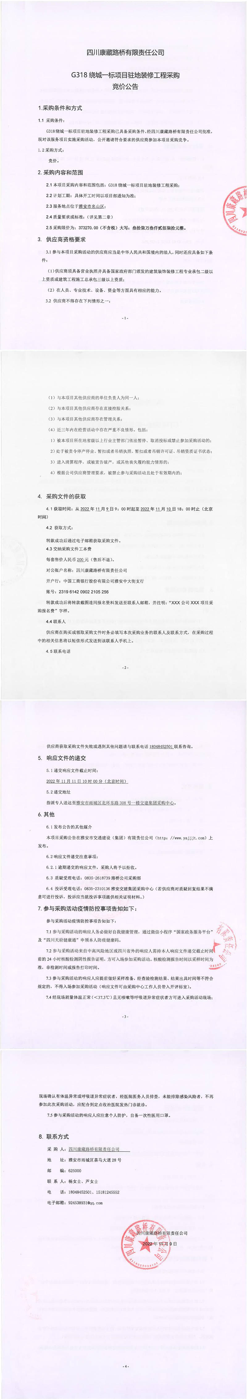 四川康藏路桥有限责任公司G318绕城一标项目驻地装修工程采购竞价公告