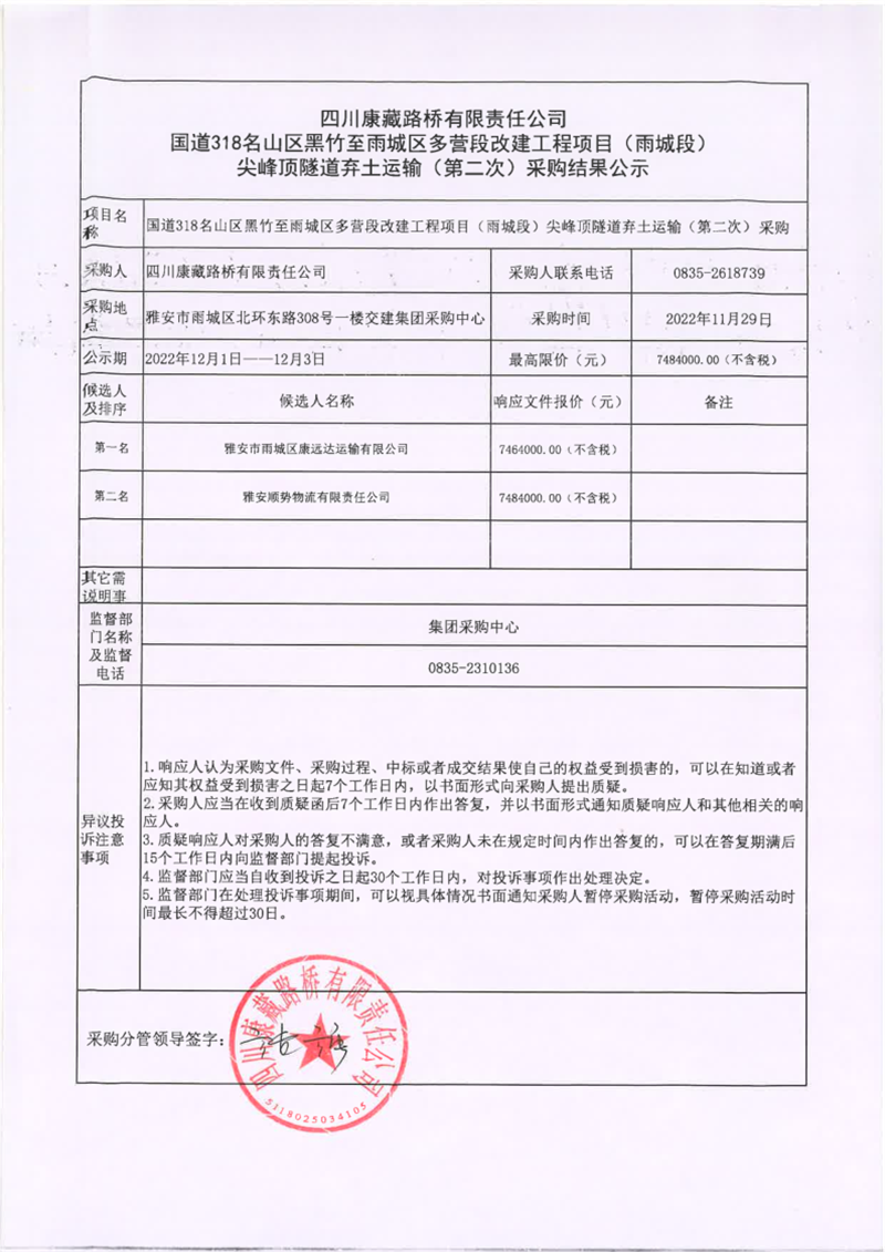 四川康藏路桥有限责任公司国道318名山区黑竹至雨城区多营段改建工程项目(雨城段)尖峰顶隧道弃土运输(第二次)采购结果公示