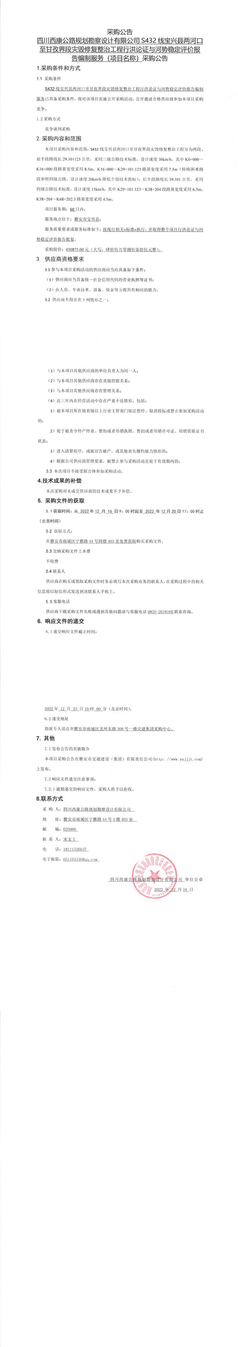四川西康公路规划勘察设计有限公司S432线宝兴县两河口至甘孜界段灾毁修复整治工程行洪论证与河势稳定评价报告编制服务(项目名称)采购公告