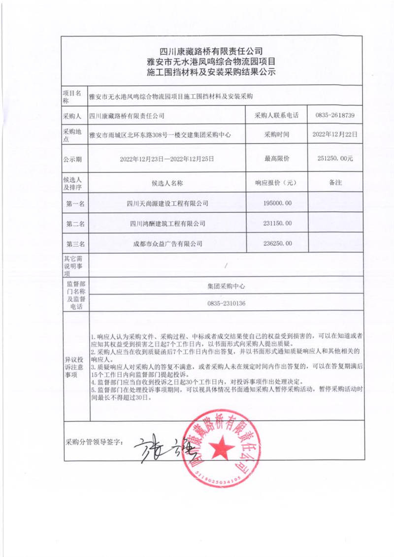 四川康藏路桥有限责任公司雅安市无水港凤鸣综合物流园项目施工围挡材料及安装采购结果公示