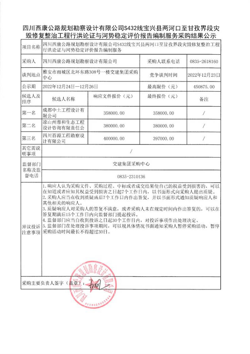 四川西康公路规划勘察设计有限公司S432线宝兴县两河口至甘孜界段灾毁修复整治工程行洪论证与河势稳定评价报告编制服务采购结果公示