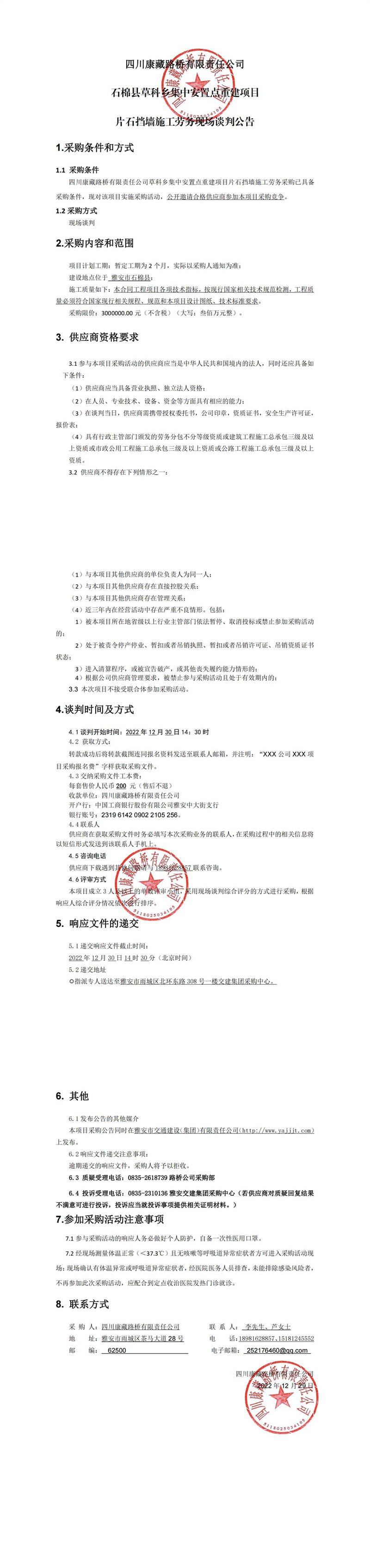 四川康藏路桥有限责任公司石棉县草科乡集中安置点重建项目片石挡墙施工劳务现场谈判公告