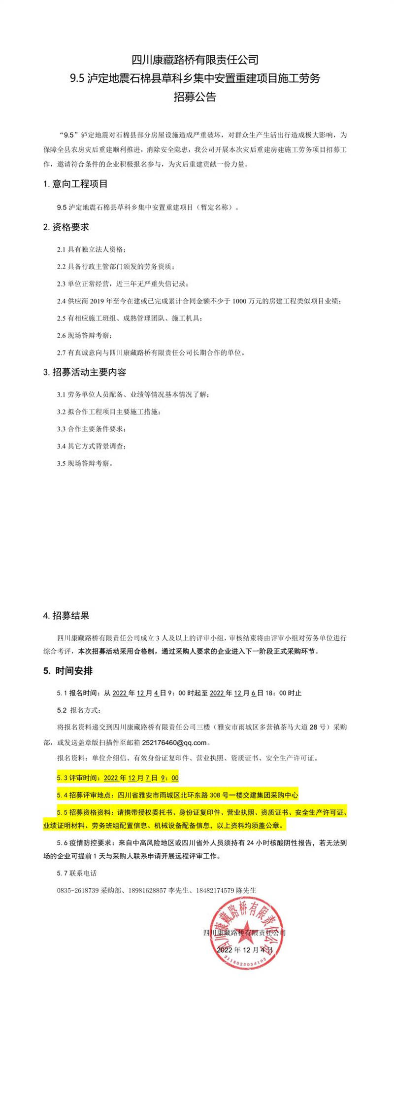 四川康藏路桥有限责任公司9.5泸定地震石棉县草科乡集中安置重建项目施工劳务招募公告