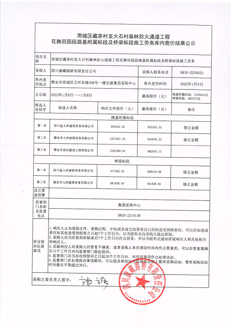 四川康藏路桥有限责任公司雨城雨城区藏茶村至大石村森林防火通道工程花舞田园段路基附属标段及桥梁标段施工劳务库内竞价结果公示