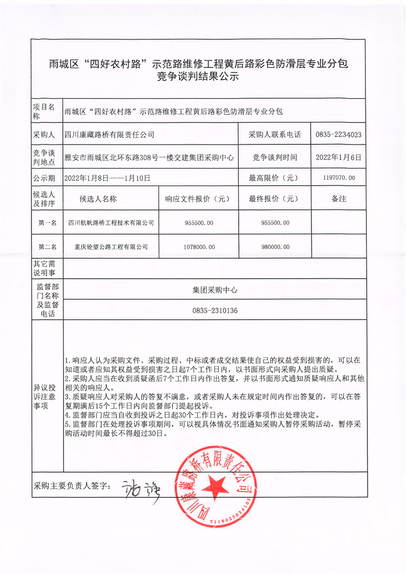 四川康藏路桥有限责任公司雨城区“四好农村路”示范路维修工程黄后路彩色防滑层专业分包竞争谈判结果公示