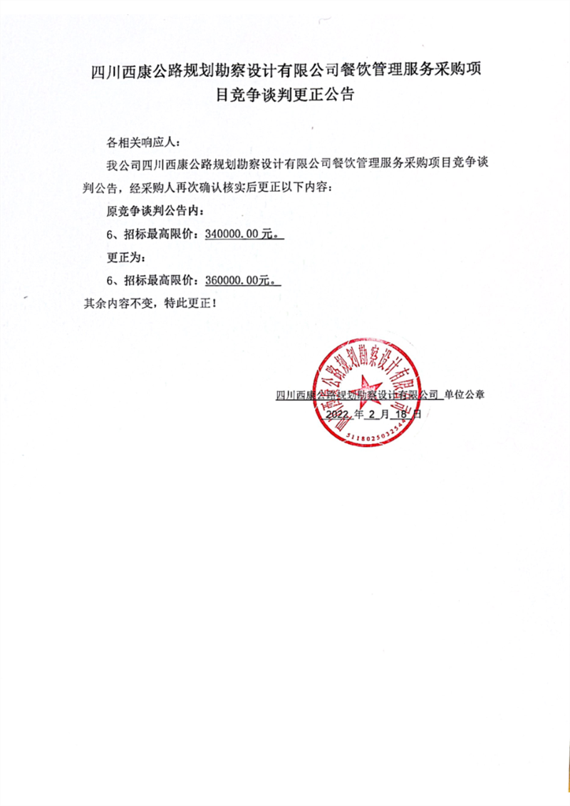 四川西康公路规划勘察设计有限公司餐饮管理服务采购项目竞争谈判更正公告(第二次)