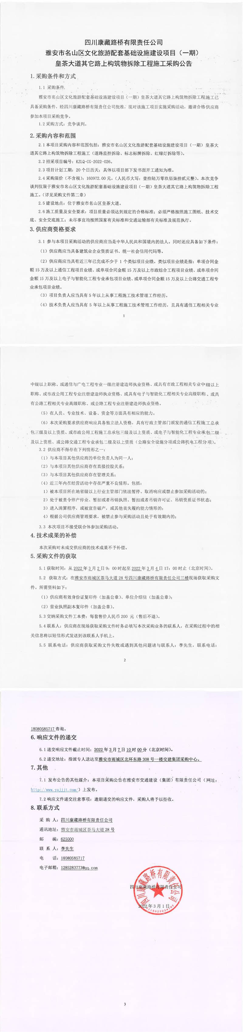 四川康藏路桥有限责任公司雅安市名山区文化旅游配套基础设施建设项目(一期)皇茶大道其它路上构筑物拆除工程施工采购公告