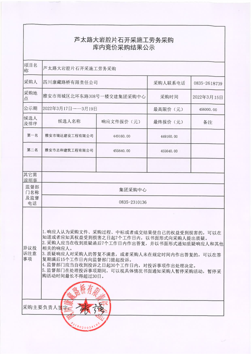 四川康藏路桥有限责任公司芦太路大岩腔片石开采施工劳务采购库内竞价采购结果公示