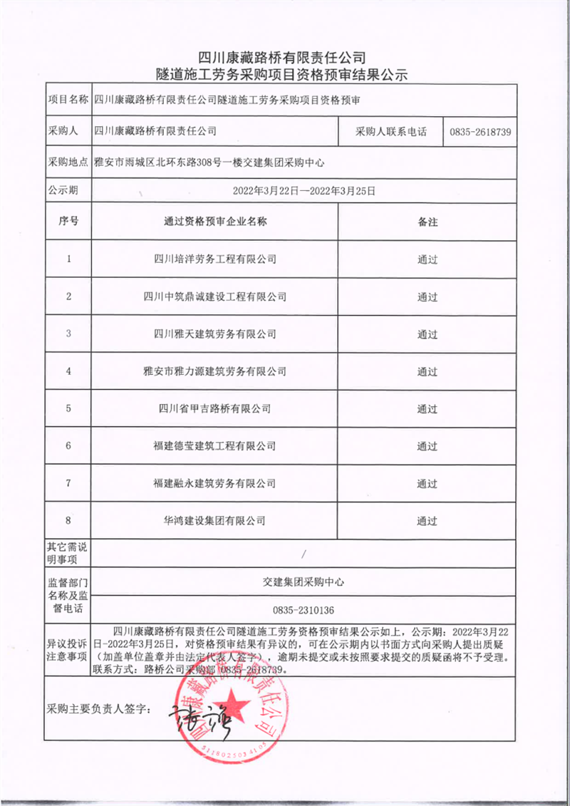 四川康藏路桥有限责任公司隧道施工劳务采购项目资格预审结果公示