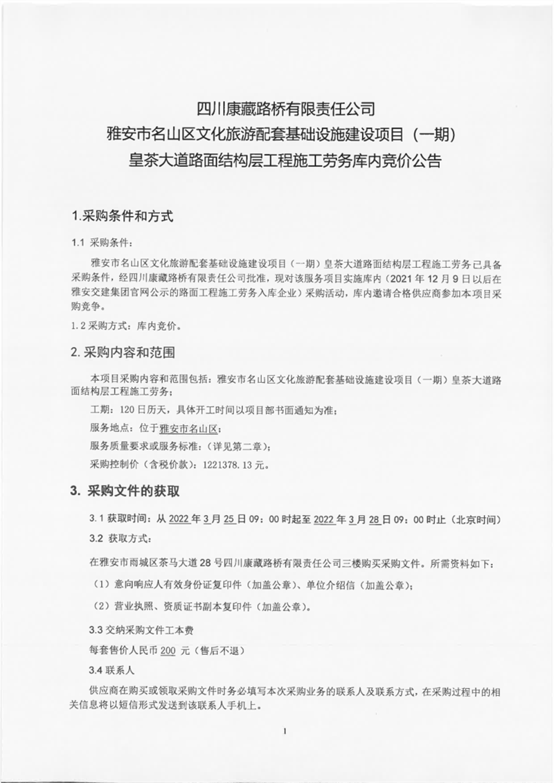 四川康藏路桥有限责任公司雅安市名山区文化旅游配套基础设施建设项目(一期)皇茶大道路面结构层工程施工劳务库内竞价公告