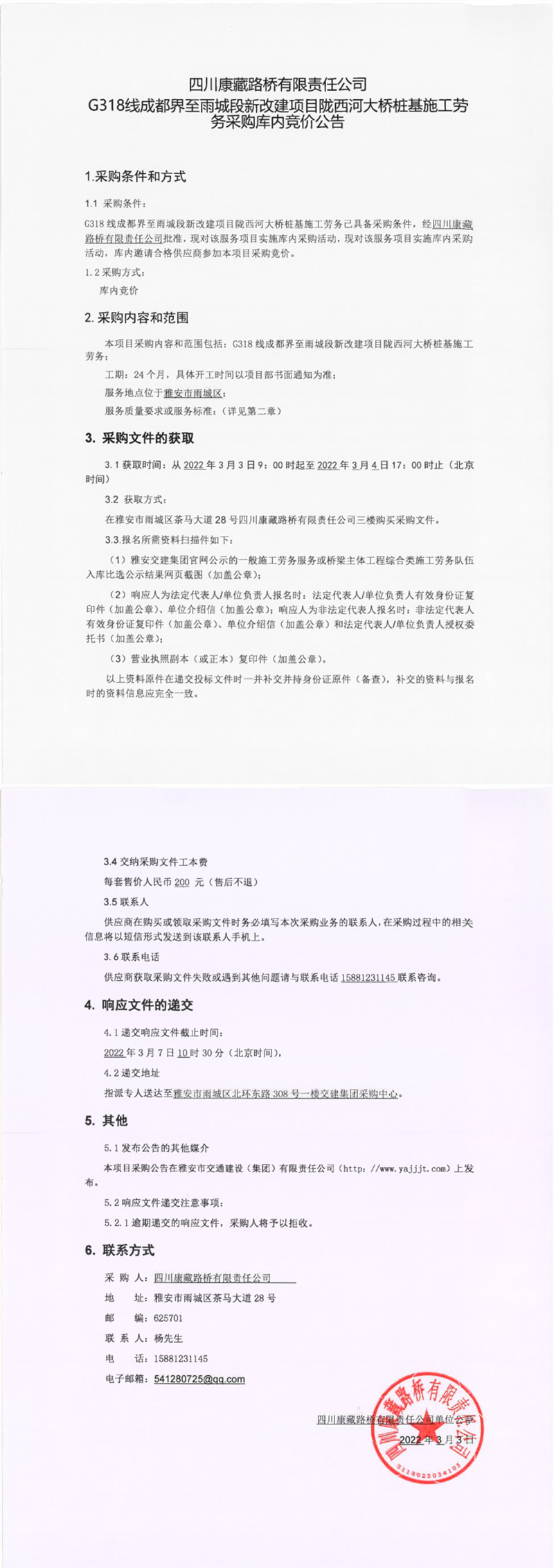 四川康藏路桥有限责任公司G318线成都界至雨城段新改建项目陇西河大桥桩基施工劳务采购库内竞价公告