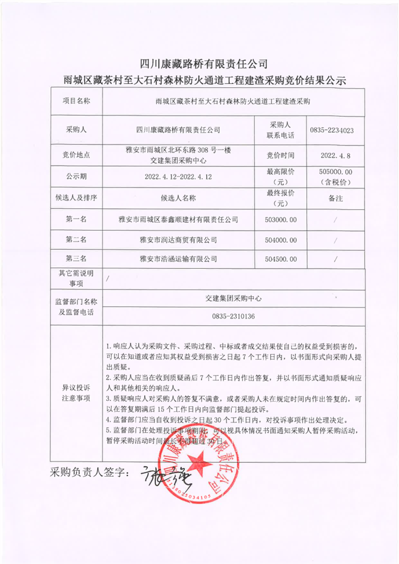 四川康藏路桥有限责任公司雨城区藏茶村至大石村森林防火通道工程建渣采购竞价结果公示
