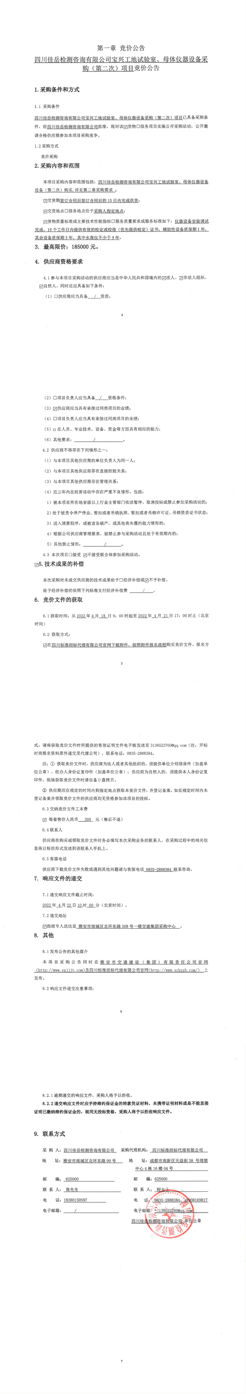 四川佳岳检测咨询有限公司宝兴工地试验室、母体仪器设备采购(第二次)项目竞价公告