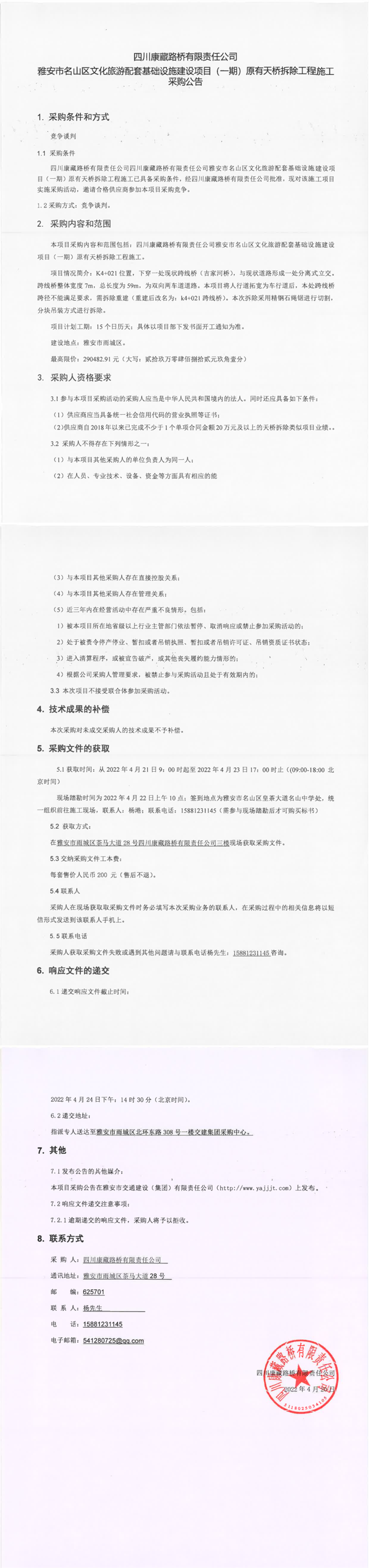 四川康藏路桥有限责任公司雅安市名山区文化旅游配套基础设施建设项目(一期)原有天桥拆除工程施工采购公告